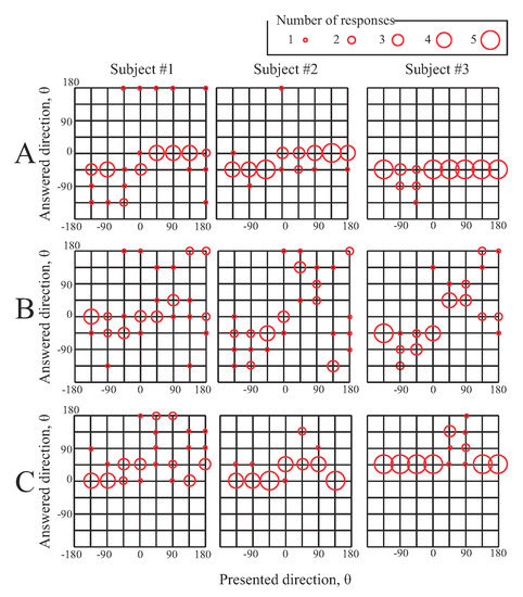 Results: The subjects listened to a stereophonic sound and answered from which direction the sound was heard. A, B and C are the same as in Figure 11.
