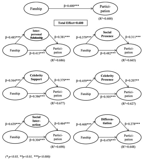 Figure 3 and Table 4 indicate that the mediating effects of all each motivation factors were statistically significant; the impact of fanship (IV) on the motivation factors (MV), the impact of fanship on the extent of participation during viewing V Live (DV), the impact of motivation factors on the extent of participation during viewing were all significant. Moreover, all the direct effects of six motivation factors were less than the total effect. In other words, the relationship between fanship and participation was mediated by motivation for use: “Interpersonal relationship”, “Social presence”, “Celebrity support”, “Celebrity presence”, “Social interaction”, and “Differentiation”. All the conditions for Baron & Kenny (1986) were satisfied []. A partial mediating effect was found on the relationship between each motivation factor and participation.