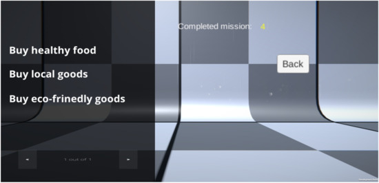 When the system is turned on, the system will display the main interface. The user can view the mission through the button linked to the mission interface on the main interface. In the mission interface, missions are displayed in text form (see Figure 2). Users can browse the mission interface to view the content of mission when shopping, and view the number of completed mission after shopping. In order to motivate users to complete mission, we designed a virtual environment based on AR pet in the system. If users complete the mission, they will get feedback in the virtual environment. The content of the mission is set to be related to shopping, such as purchasing products that meet a certain requirement. When a user chooses to purchase a product that meets this requirement, the mission will be deemed completed. On the contrary, if there is no product that meets this requirement among the products purchased by the user, the mission is considered to have not been completed. Users can freely choose the mission they want to complete during shopping according to their preferences. If the mission is failed, users will not receive rewards.
