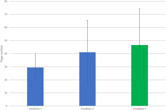 In the experiment, a session was a one-day online shopping experiment. We calculated the number of pages per session [45] in the three conditions (see Figure 7). In condition 1, the average pages per session per person was 29.4 (SD = 10.5); in condition 2, the average pages per session per person was 41.1 (SD = 24.4); and, in condition 3, the average pages per session per person was 46.5 (SD = 27.7).