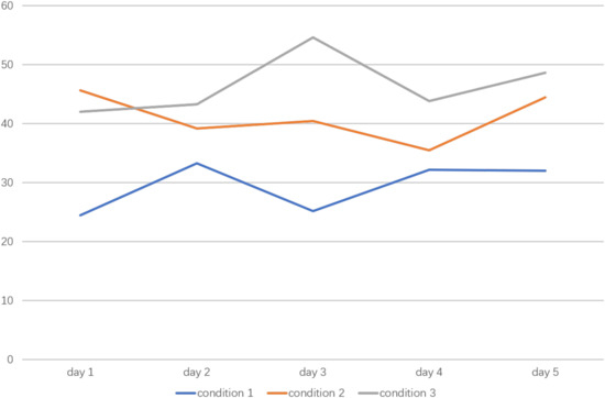 In experiment 1, we did not take balance measures design (i.e., reversing the order of half the participants). We consider the practice effect (i.e., training effect) could be a problem in our experiment as the performance becomes better. As for practice effects, it will not only exist between the conditions but also within each condition because five-day experiment was conducted for each condition. Differences between conditions may come from the practice effect or the difference of conditions while the difference within the condition only comes from the practice effect. Therefore, we judge the impact of the practice effect within the condition. As shown in the Figure 8, we found not much practice effects within each condition in this case. Therefore, we think that we can believe that the significant difference mainly comes from different conditions rather than practice effects.