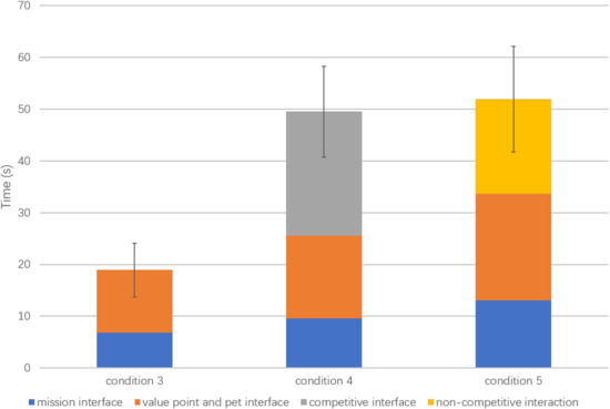 The usage time of each interface (i.e., mission, value point and pet, and competitive interaction interface) of the system was recorded (see Figure 10). In condition 3, each user used the system for 18.93 s on average in one session (SD = 5.2); under condition 4, the number was 49.51 s (SD = 8.8).