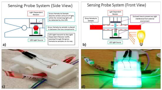 The Light Emitting Diode-Light Dependent Resistor (LED-LDR) Light sensor probe system. An external power source powers the Light Emitting Diode (LED) light. The Light Dependent Resistor (LDR) connects to the Arduino Uno Board records the amount of light intensity received. Both components are kept in a clip as shown in (a,b) and measure the light intensity blocked by the gross haematuria samples in an enclosed environment without any external light interference (c,d).