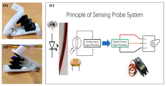 The visible light spectrum has been utilized in blood detection. One of the typical applications is photoplethysmography (PPG) [5,6,7]. As hemoglobin would absorb infrared light in PPG, the presence of blood would disrupt or redirect the signal transmission between the near-infrared light receiver, thus calculating the heart rate of the subject. Other noninvasive methods utilize both red light and near-infrared light to detect the presence of blood in certain parts of the body [8,9,10,11,12,13] as hemoglobin in red blood cells allows red color light to be transmitted through the cells. The automatic bladder irrigation created by Ding et al. [14] has utilized color sensors to detect different blood concentration values to control the rate of saline drip. Based on that, we propose an automatic feedback control system to control saline drip based on blood concentration detected. The system consists of two main components. The first component is a sensor probe that differentiates blood concentration in gross hematuria using the principle of light absorption of blood samples. The second component is a gripper that controls the saline drip-rate via a software program.