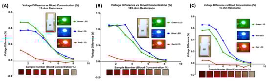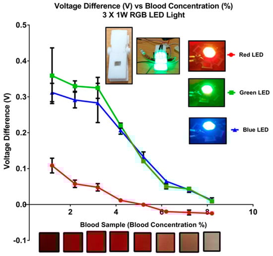 From the test results, as shown in Figure 4, the red color light spectrum was the worst compared to the blue and green color light spectrum in measuring blood concentration as it can pass through the hemoglobin in the red blood cell. The difference between each blood concentration value was negligible. On the other hand, the blue color light spectrum and green color light spectrum had comparable performance and were able to detect different concentrations better as the two color spectrums were absorbed by the hemoglobin.