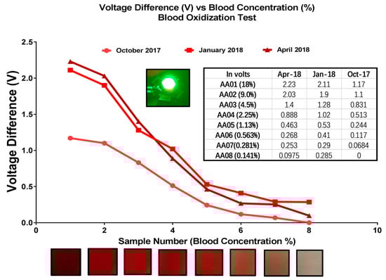 A deoxidized test was also conducted, as shown in Figure 5. Deoxidized blood (old blood) would have a much darker color as compared to the fresh blood that was extracted out from the human immediately. To see if the sensing probe can differentiate fresh blood and old blood, blood samples were stored for six months and eight months and then compared to see the difference in blood color using the green LED light color. The results have shown that there is a significant difference in the voltage readings between fresh blood and old blood.