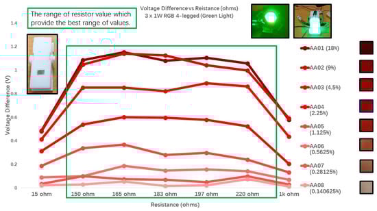Performance comparisons for different resistance values of 15 ohms (A), 183 ohms (B), and 1 k ohms (C). Despite the change in resistance, results have shown that the performance between the three color spectrums remains the same, with red color light spectrum the worst among the three and the blue and green light spectrum to be equally comparable under the normal light intensity condition.