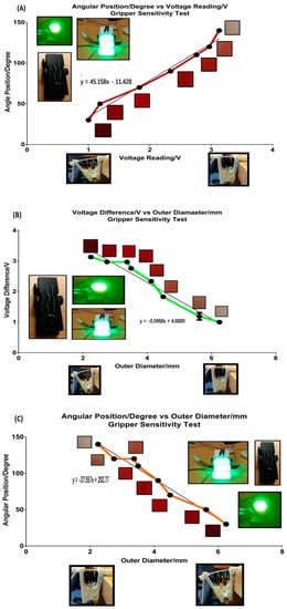 The relationship between Angular Position of Servo motor and Voltage Reading of LDR, as shown in (A). The relationship between Voltage Difference and Outer Diameter, as shown in (B). The relationship between Angular Position of the servomotor and Outer Diameter of Saline Tube, as shown in (C).