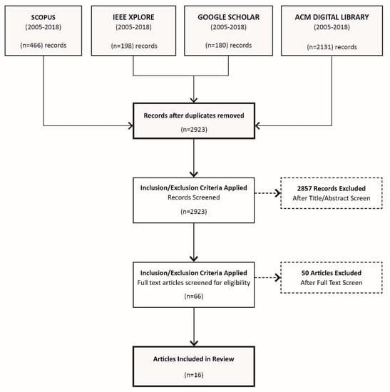 An electronic search of Scopus, Google Scholar, Institute of Electrical and Electronic Engineers (IEEE) Xplore and Association Computing Machinery (ACM) Digital Library databases was conducted with data range from January 2005 to April 2018 using the Preferred Reporting Items for Systematic Reviews and Meta-Analyses (PRISMA) statement []. In order to identify the relevant literature, alternate terms such as “eHealth”, “outdoor spaces”, “assistive technologies”, “therapeutic landscape”, “elderly”, “old people”, “smart spaces”, “smart outdoor”, “mHealth”, “eHealth technologies”, “outdoor environment”, “ambient assistive living”, “aged”, “rehabilitation”, were used with Boolean operators (e.g., AND, OR) to determine the solution space. Data sources generated a total of 2975 results from all the databases and passed through multi-level screening as shown in Figure 1.