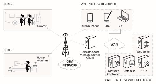 Lin et al. [] presented a system which integrates technologies of radio frequency identification, Global Positioning System (GPS), a Global System for Mobile Communications (GSM) network and geographic information system (GIS), as shown in Figure 2, to construct a stray prevention network for older people with dementia without interfering with their daily lives.