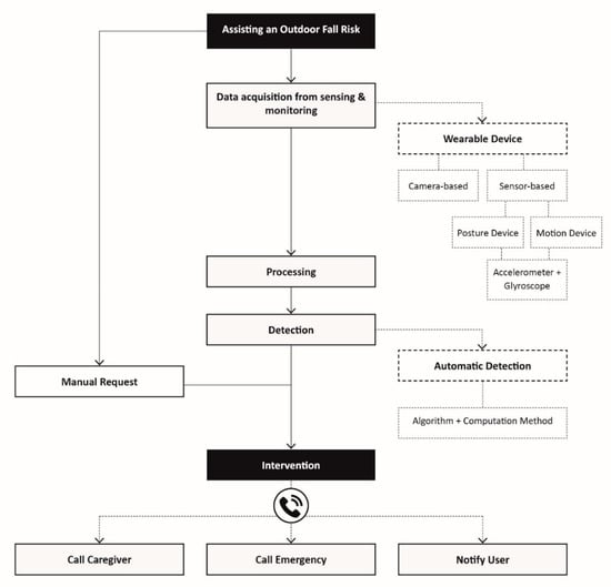 Yared et al. [] proposed a schema for detecting falls in an outdoor environment using wearables such as smartphones and sensors as shown in Figure 5. They propose the use of eHealth technologies capable of delivering ubiquitous assistance services and integrated platforms that support safety, independence and overall well-being of older persons in outdoor spaces. Islam et al. [] applied Internet of Things (IoT) technology to health care delivery and services. IoT is defined as a technological concept of showing a connected set of anything, anyone, anyplace any service and any network. Although IoT is in its infancy in medical applications, it is projected to revolutionise and redesign modern health care with promising techno-economic and social aspects. Islam et al. [] surveyed the advances in IoT-based health care technologies, state-of-the-art network architectures and industrial trends.