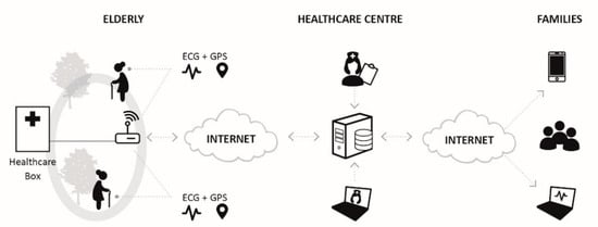 A smart outdoor eHealth monitoring device to detect fall and ECG signals for older persons with a proposed multi-thread method in order to improve both the response time and detection accuracy was proposed by Wang et al. []. The proposed intelligent system consists of a multi-function healthcare box to be carried around by the elderly patient, monitoring the GPS location and ECG data of the patient as shown in Figure 6. This research also found that the accuracy of detection was dependent on movement, location variation and interference.