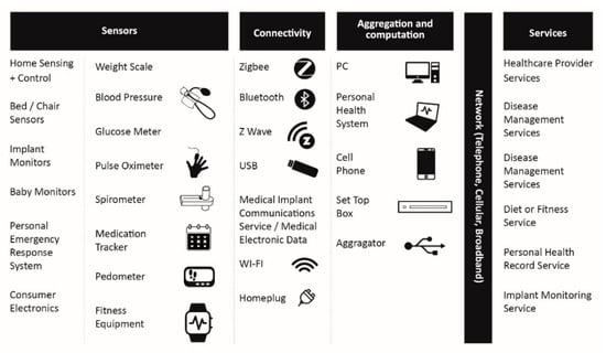 In 2016, Hossain and Muhammad [] presented an IoT-enabled eHealth monitoring framework, where integrated devices such as mobile devices and sensors collected ECG and other healthcare data to be securely sent to the Cloud for seamless access by medical personnel. These data were watermarked for security reasons and then sent via communication media such as Bluetooth, Wi-Fi, internet and cellular technologies. Another IoT-aware architecture for performing behavioural analysis and risk detection of elderly patients over cellular technology used a different type of sensor to capture mobility, outdoor localization and ambient parameters []. The proposed smart city-oriented system captured and processed heterogeneous data in an assistive environment at multiple levels. The data model allowed participating cities to choose the level of abstraction that could be used for system integration []. Similarly, Hu et al. [] used IoT medical sensors through Cloud computing to monitor chronic health conditions of elderly patients over cellular technology. The proposed Cloud computing architecture can safely and securely monitor the health of older persons for chronic conditions, anywhere including outdoor locations.