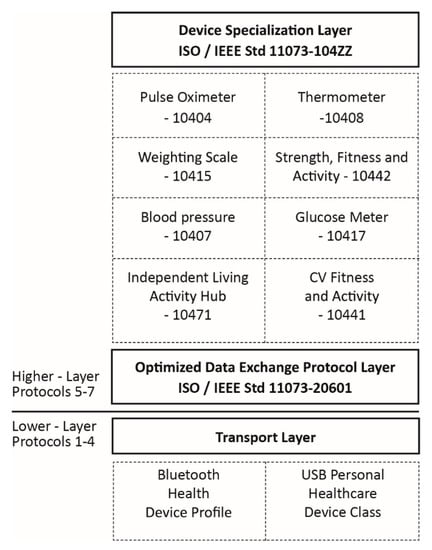 The PAN interface connects the PAN device (a sensor or an actuator) to the application-hosting device (cellphone or a personal computer) via wired or wireless technologies [,]. Figure 8 shows the hierarchical Continua open systems interconnection (OSI) 7-layer model with relevant standards for the PAN interface. The PAN lower layers consist of the classic OSI layers 1–4 with USB and Bluetooth as communication technology options while the upper layers comprise the standard OSI layers 5–7 which are deployed using the ISO/IEEE Std 11073-20601 Optimized Data Exchange Protocol.