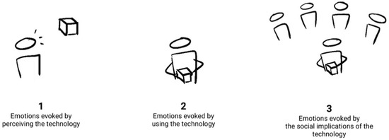 There are many different theories explaining the experience of emotions in product design, such as Norman’s neurobiological approach [18], Hassenzahl’s approach based on universal psychological needs [19], or Desmet’s appraisal approach [20]. Appraisal theory says that emotions are elicited from a distinct set of appraisals or assessment patterns [21]. Appraisals serve to evaluate one’s needs and environmental conditions based on several factors such as control, pleasantness, and certainty, based on which they would classify the situation as beneficial, detrimental, or irrelevant to their well-being, leading to positive or negative emotions [22]. These different emotions enable one to adapt to different environmental demands or opportunities [23]. What is noteworthy is that depending on the person, the same situation can result in different emotions because the ways people appraise the situation can be different, affected by their own values and concerns [24]. This implies that in human–product interactions, the types of emotion are not determined by the product itself, but by the personal concerns and contexts where the product is placed and how it is used, what meanings the user attributes to it, and how the user talks about it [25,26]. For example, a smart watch that controls multiple devices may inspire a person with its sophisticated features today, but the same person may be worried by it tomorrow when realizing that its potential to leak their private information. Hence, it is crucial to consider that the emotion can be evoked not only by the designed technology or its appearance but also by the relational meaning of the designed experience, such as personal associations, concerns, social implications of the design, which can serve as points of reference for design conceptualization and evaluation [26,27].