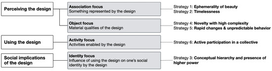 Based on these three overarching categories of perceiving the design, using the design, and social implications of the design, six design strategies were further categorized. The strategies were clustered and categorized based on their similarity in terms of their causes guided by the framework. For example, design Strategy 4 and 5 on novelty, complexity, and unpredictable behavior were categorized underneath perceiving the design with perception-focus. Based on the narratives and the context in which these strategies were used, the stimulation from perceiving the design itself was considered what evoked awe. In this case, the design did not need to be used, nor did it inspire any associations with social implications. Figure 2 shows how the strategies were classified based on the three sources of product emotions.