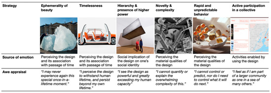 This section describes the resulting six strategies to design for awe. Each of the six strategies is detailed with the following structure: how the strategy supports elicitation of awe, how the source of emotion is related to the awe appraisal pattern, associated design examples provided by the participants, and how to apply the strategy to design a product in a concrete and specific way, i.e., implementation. The suggestions for strategy implementation were derived from the descriptions of participants’ awe experiences in relation to the chosen artifacts and their aspects. Note that the implementation suggestions are based on the ways that we observed the strategies being applied in the collected data. There can be a wide range of alternative ways each of the strategies can be utilized to manipulate the design. Figure 3 proves a comparative overview of the six strategies.