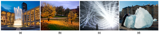 Examples suggested by the participants (Reprinted with permission): (a) Lincoln Center fountains, (b) leaves changing color, (c) TeamLab light sculpture, and (d) Ice Watch