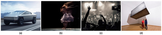 Examples suggested by the participants (Reprinted with permission): (a) Tesla cybertruck, (b) artist concert performance, (c) listening to music, and (d) Drifter.