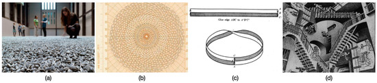 Examples suggested by the participants (Reprinted with permission): (a) Ai Wei Wei sunflower seeds, (b) Agnes Denes Fibonacci sequence pyramid, (c) Mobius strip, and (d) M.C. Escher staircase illusion.
