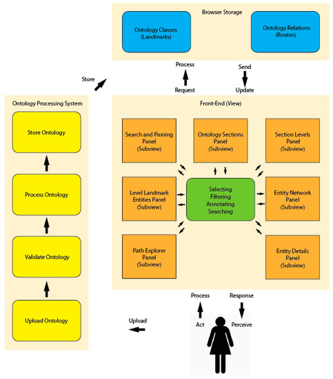 Once the ontology processing subsystem has completed its work, the ‘front-end’ system which performs the visualization of the ontology dataset starts. The system accesses the stored ontology data, analyzes it, and directs that data to each of the subviews which are shown across the available visual space.