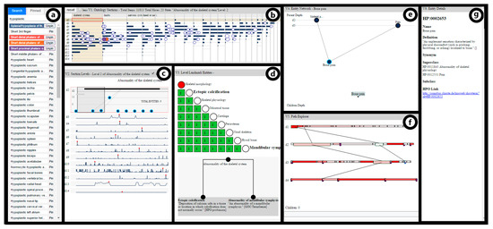 An overall view of the PRONTOVISE ontology visualization system, which has seven subviews: Search and Pinning Panel subview (a); Ontology Sections Panel subview (b); Section Levels Panel subview (c); Level Landmark Entities Panel subview (d); Entity Network Panel subview (e); Path Explorer Panel subview (f); and Entity Details Panel subview (g).