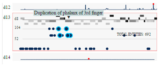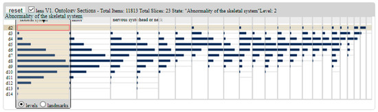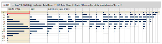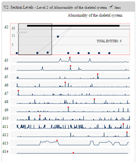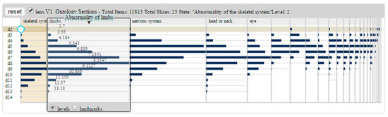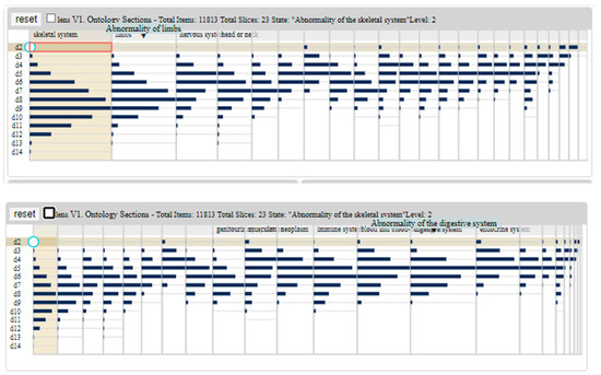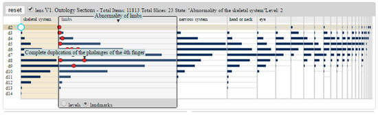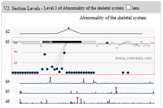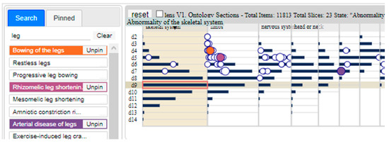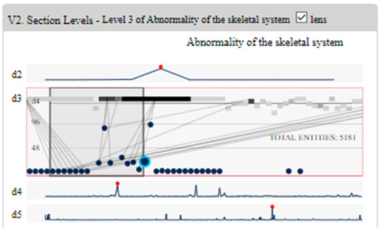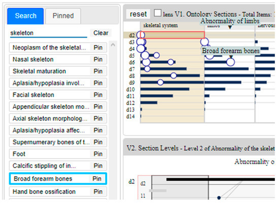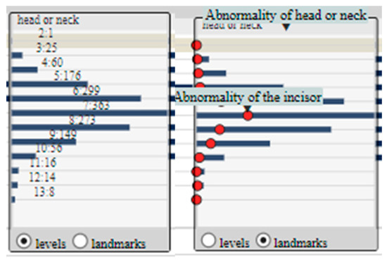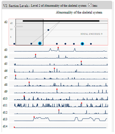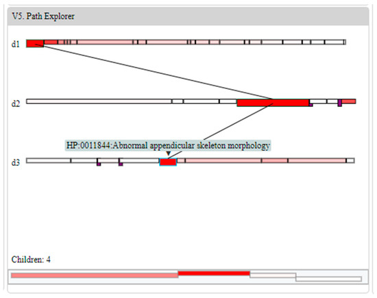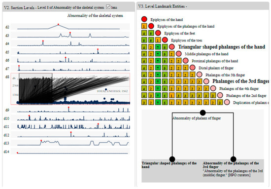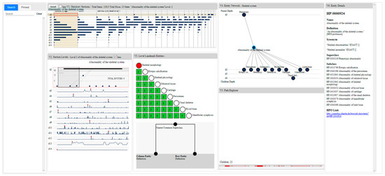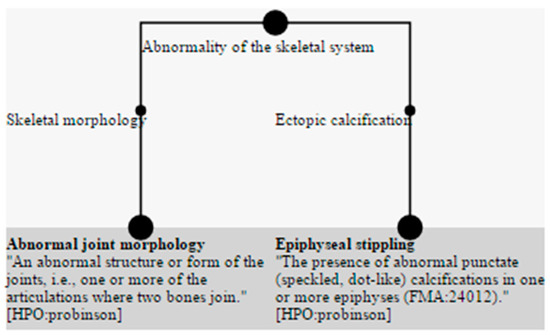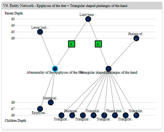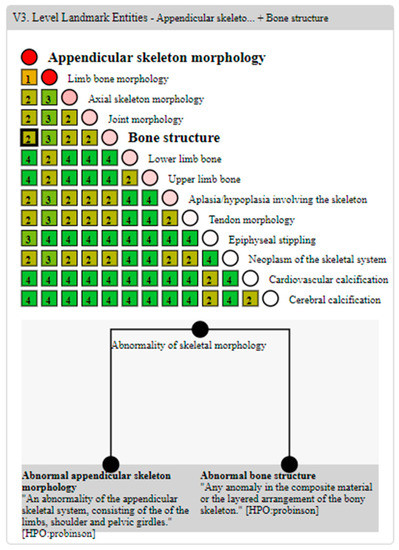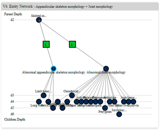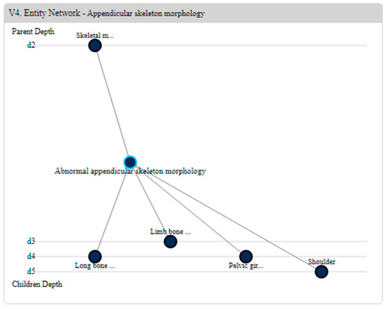 We see that the chosen “Abnormal Appendicular Skeleton Morphology” entity directly inherits from a single ontology entity and is inherited from four other ontology entities on various ontology section levels. We then select two entities for the entity network within the prior Level Landmark Entities Panel subview, and the two ontology entities are used as positions side-by-side, as depicted in Figure 31.