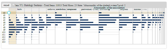 Notably, our interactions with the Entity Network Panel subview have updated the Path Explorer Panel subview. If the ontological distance between ontology entities is larger than one step, the Entity Network Panel subview shows us a simplified encoding of that extended routing. The Path Explorer Panel subview allows us to explore the complete ontology structure and content along a full inheritance path originating from the ontology section root all the way to the current position. We see that whenever we interact with the current entity, this subview will depict the full ontology from that entity relative up to the top level. This can be seen in Figure 32, when we chose “Abnormal Appendicular Skeleton Morphology” as our ontology entity of interest. Just like in the earlier subview, we interact with each part of the subview to inspect, compare, and navigate through each to generate new encounters which promote cognitive map formation.