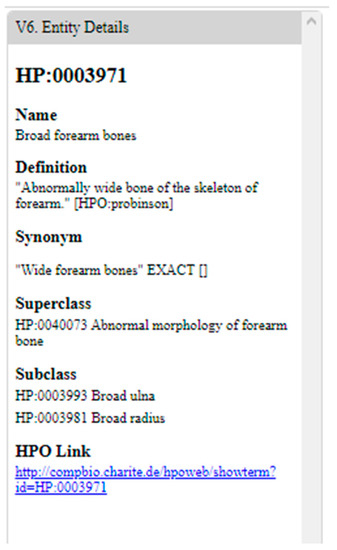 When “Broad Forearm Bones” has been selected within any subview, the Entity Details Panel subview depicts all information for that ontology entity as provided by HPO.