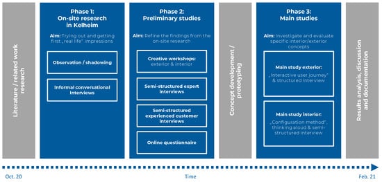 Based on research of related work and the findings of the on-site research in Kelheim, for the second phase of UCD [] the project team designed a set of low-fidelity studies, separately for the aspects of interior design and external communication, in a joint vote. The studies were each designed applying appropriate methods.