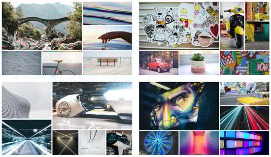 Moodboards from which the participants had to select in the creative workshop of the exterior team. (Top left): quiet-restrained. (Top right): childish-comic. (Bottom left): modern-futuristic. (Bottom right): strikingly-obtrusive (Image sources: Unsplash, https://unsplash.com (accessed on 29 July 2021).