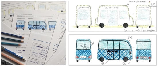 Impressions of the results from the sketch-a-bus exercise of the creative workshop by the exterior team. The test persons were asked to draw, color and design the exterior of the bus according to their own ideas. A template (outline of the bus) was given (Image sources: own photo/scans).