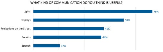 Furthermore it was expressed by several people that a visual “communication with lights and displays would be useful”. Quantitative data from the online questionnaire underline this statement as 76% of the participants think that lights are the most useful way of communication followed by 58% for displays (see Figure 5). Further results of the creative workshop show the desire for easily understandable light signals, e.g., with color coding that is already known from the traffic light system (red and green). Concepts that communicate via auditory signals were least often seen as meaningful (last two places) which can be explained on the basis of qualitative data, since sounds or language are often perceived as unpleasant, aggressive or even as noise pollution.