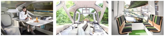 The first influence relates to the different user groups which value different aspects throughout the interior experience []. Lundquist [] used the example that a tourist wants understandable information about the surrounding to localize better and more easily, whereas a commuter needs reliable information about traffic conditions, delays, or changes. In addition, according to Vesa [], users are driven by different motivations to take a shuttle bus. Knowing these provides the opportunity to target some motivations especially in the interior []. Furthermore, different user groups engage with different activities within the bus. Knowing what users are currently doing within the shuttle and what they want to do in the future, provides the opportunity to design richer experiences for specific activities []. The “Mercedes Future Bus”-concept, for example, offers wireless smartphone charging spots within the bus []. These different wants, needs, activities, and motivations of the users must be taken into account when thinking about future interior designs for an automated shuttle bus.