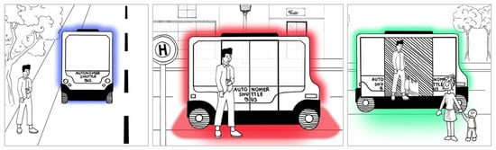 - Mirnig, A.G.; Wallner, V.; Gärtner, M.; Meschtscherjakov, A.; Tscheligi, M. Capacity Management in an Automated Shuttle Bus: Findings from a Lab Study. In Proceedings of the 12th International Conference on Automotive User Interfaces and Interactive Vehicular Applications, Online, 21–29 September 2020; Association for Computing Machinery: New York, NY, USA, 2020; pp. 270–279. [Google Scholar] [CrossRef]
