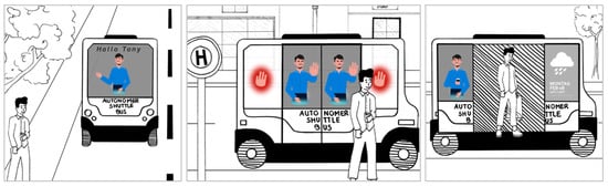 Chang et al. [] designed a visual interface adding eyes on a car. This interface is able to express the car’s intention by establishing eye contact with pedestrians and it can therefore help pedestrians to make a correct street-crossing decision, as it can increase the subjective feeling of safety. Moreover, Hutson [] describes that a humanized car makes the passengers feel calm in emergencies by giving the car a voice and verbalizing its maneuvers—which suggests that they trusted the car because they had anthropomorphized it. Mahadevan et al. [] have also observed positive attitudes towards human-like interaction, using a virtual robotic driver in the windshield. However, they [] mentioned that anthropomorphic cues such as animated face or eye gaze can be difficult to interpret. Similarly, Löcken et al. [] described that adding eyes to the car to simulate eye contact did not provide a clear signal to cross the road and caused an effect known as uncanny valley in human–robot interaction []. Nevertheless, many manufacturers including Jaguar Land Rover [], Toyota [], and Semcon [] apply the eye contact and smiling concept to their AVs. It shows that it could improve confidence if the AV makes eye contact with pedestrians to show that they have seen them, and they are safe to cross the street.