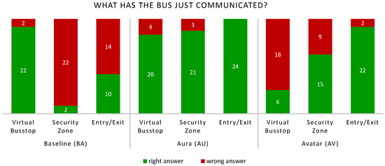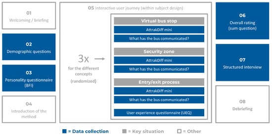 Regarding the research method, we decided against virtual approaches and in favor of field studies (embedded in a mixed design with additional qualitative methods, as suggested by []). For the development of user interfaces, a realistic interaction behavior with high immersion plays a major role. Meanwhile, augmented and virtual reality has a lot of potential for user research due to its increasing immersion [] and has already been used, e.g., to investigate interaction concepts for eHMIs of automated vehicles []. Nevertheless, for the actual work we wanted to perform user studies with automated shuttle buses in real-life and use the (experience with) existing technology as a basis for further developments. This was negatively affected by COVID-19 (but lab studies with AR/VR headsets would have also been subject to these limitations).