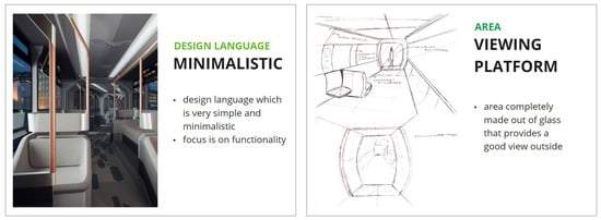 Furthermore, for the interior of the automated shuttle bus some problems (→ opportunities for improvement to be used in the pre-study interior, see Section 5.3.2) were identified. The most noticeable opportunity was the unpleasant seating direction and limited space. Three of the total of six seats were oriented against the direction of travel, resulting in motion sickness [] for a large number of people. This aspect is directly related to the generally small size of the interior of the automated shuttle bus. This is particularly evident in the two rows of seats that have little space between them and do not offer enough personal space. Additionally, these two rows of seats offer no possibility for passengers to store personal items such as bags. The interior design language of the automated shuttle bus, which is not clearly defined, offers further potential for improvement. The design language seems rather random and not well thought-out with a current mix of different design styles and materials. The lack of consistency leads to an overall lack of ambience and few characteristics that promote well-being among passengers. The third problem area lies in the communication and presentation/visualization of information. Currently, the automated shuttle bus communicates information only visually via an overhead display. This purely visual presentation may not be sufficient and should be supplemented by an additional form of information presentation, such as audio announcements. Especially for persons with disabilities, the current form of information is insufficient.