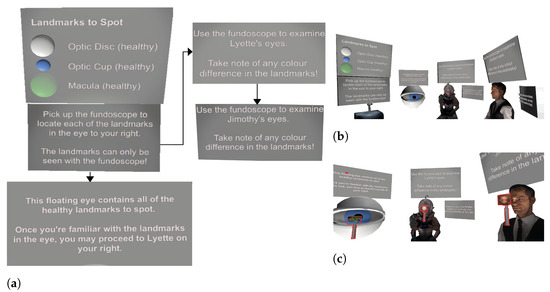 Virtual DO examination scenario update comparison. (a) Previous virtual scenario without the static ophthalmoscope add-on. (b) Tasks workflow. (c) Updated virtual scenario with static ophthalmoscopes for ease of fundus view in front of each virtual patient.