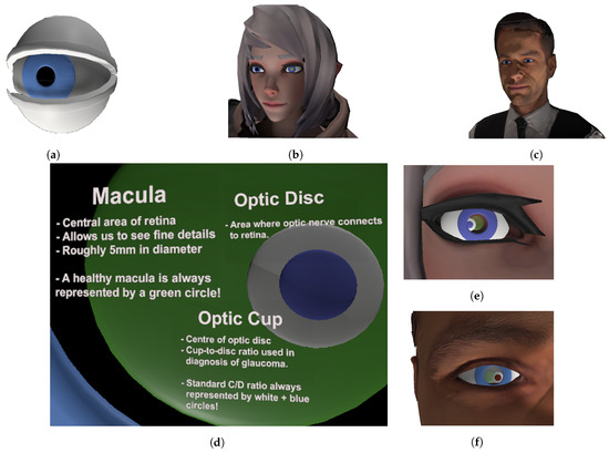 Virtual avatars and eye fundus close up for eye examination. (a) Floating eye. (b) ‘Lyette’ virtual patient. (c) ‘Jimothy’ virtual patient. (d) Floating eye fundus. (e) ‘Lyette’s’ eye fundus. (f) ’Jimothy’s’ eye fundus.