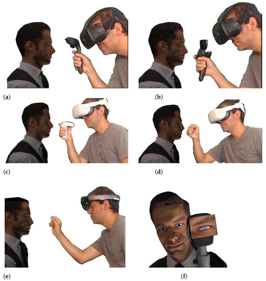 Virtual patient examination with five different 3D user interface devices. (a) HTC Vive controller. (b) Valve Index controller. (c) Oculus Quest 2 controller. (d) Oculus Quest 2 hand tracking. (e) Microsoft HoloLens 1 Pinching gesture. (f) Ophthalmoscope view with ‘Jymothy’.