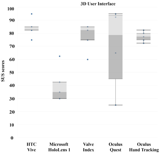 Figure 4 presents the SUS scores distribution for Stage 1, HTC Vive controller (M = 86.25/100, sd = 7.20), Valve Index controller (M = 77.50/100, sd = 3.95), and Microsoft HoloLens 1 hand gesticulation (M = 40/100, sd = 13.57) are consistent with the findings reported in [25] with 10 ten participants, where the the physical controllers, the HTC Vive ((M = 92.50, sd = 3.953), and the Valve Index (M = 84.50, sd = 15.949) were perceived as more usable than the hand gesticulation with Microsoft HoloLens 1 (M = 41.30, sd = 16.86). With respect to Stage 2, the SUS scores for the Oculus Quest controller (M = 70.76/100, sd = 17.08) and Oculus Quest hand tracking (M = 58.84/100, sd = 23.24). Additionally, the Shapiro–Wilk test indicates that the SUS scores for the the Oculus Quest controller(W(4) = 0.92, p = 0.31 and the Oculus Quest hand tracking (W(3) = 0.94, p = 0.56) are normal.