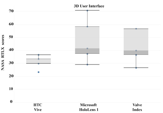 Task workload indices distribution using the NASA RTLX index for the HTC Vive, Valve Index, and Microsoft HoloLens 1 hand gesticulation. The box plot indicates the maximum and minimum values, first quartile (q1—darker grey), and third quartile (q3—lighter grey), data points (blue dots), outliers (blue points above and below the whiskers), and the median (i.e., the line between the dark and light gray boxes) within the interquartile range.