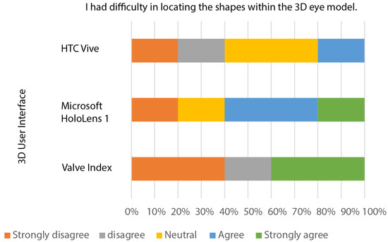 The difficulty associated with locating the anatomical landmarks inside the virtual eye was consistent with the usability and workload results. Here, the input interactions provided by the HTC Vive and Valve Index were perceived as less difficult than the Microsoft HoloLens 1 hand gesticulation. However, in some cases, the hand tracking with the Oculus Quest 2 introduced jittering into the examination having participants use the static ophthalmoscope in the scene.