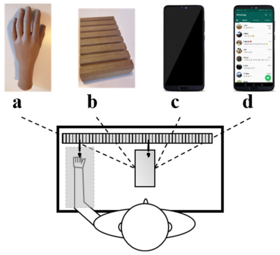 Set-up and test objects: (a) rubber hand, (b) neutral control object wooden block, (c) smartphone neutral and (d) smartphone plus activated self-relevance.