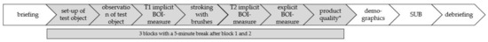 The laboratory experiment consisted of three blocks presented in randomized order. Figure 2 depicts the entire research procedure. After being informed about the experiment, the first block of the experiment started. Participants placed their left hand [34] on the table in a small box to ensure that they could not see their own hand and their right hand under the table on their right thigh. A test object (rubber hand, wooden block or smartphone neutral or smartphone plus activated self-relevance) was placed on the table in the center of the subject’s field of vision (see Figure 1). A cape covered the participants’ upper body as well as the bottom line of each object [35]. Participants were asked to initially look at the test object for 30 s. This duration was based on the maximum time needed to read the WhatsApp chat overview in the experimental condition smartphone plus activated self-relevance. To boost self-relevance in the one smartphone condition, it was also verbally instructed (“Please imagine this is your smartphone. It’s about half-past 12. You’ve just opened the app WhatsApp. Please have a look at everything and read it through”). For the pre-measurement (T1) of the implicit BOI-measurement, the ruler was put on the table, and participants were asked at what position of the ruler they localize their middle finger using steps of 0.5 cm (for example, position 10.0, 10.5, 11.0). For each block, the ruler’s starting point was varied so participants did not have a fixed reference point. Next, participants’ left hand and the test object were stroked with two brushes synchronously for one minute [21]. Right after the stimulation and without the participants moving their hands, post-measurement (T2) and explicit measurement with the BOI-questionnaire were conducted to finish the block. After the blocks 1 and 2 participants had to leave the lab for a five-minute break to avoid spillover effects [21]. After the final block, participants filled out the demographical questionnaire and the questionnaire of smartphone usage behavior. Afterward, they were debriefed and dismissed.