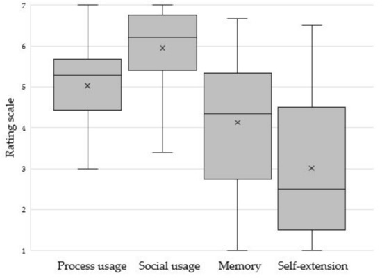The overview of the participants’ average smartphone usage behavior (Figure 3) shows mean values and standard deviations for the different subscales. While there were high agreement and low variance for the subscales process usage and social usage, indicating that the majority of participants use their private smartphone for entertainment, information seeking, and to pass the time (process usage) as well as to interact with their social network (social usage), there were lower mean values and a considerable variance for the subscales memory and self-extension. Thus, about 57.9% of participants seem to perceive their smartphone at least partly (percentage of participants who rated the items with the value 4 of 7 and higher) as a marker of their own past and memory and even fewer, 35.5% of the participants stated that their smartphone represents their own self at least partly.