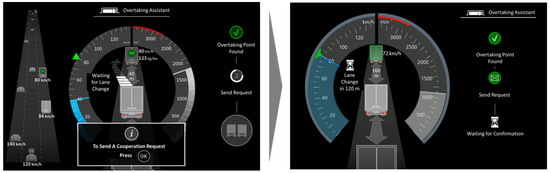 Graphics are displayed to the truck driver in the middle of the speedometer if the system recognizes potential for cooperation, determined by a vehicle in close proximity ahead and also behind. If the truck driver cooperates with one of the vehicles, it is indicated by a green background and the display of relevant metrics, e.g., the distance and speed of the vehicle [9]. All information related to the cooperation negotiation (e.g., overtaking point found, send request, waiting for confirmation, etc.) is shown in a step–progress bar on the right side of the GUI. The intention is to provide a good overview in the dashboard area and to focus the driver’s attention on a few specific subject areas [22]. The numbered sequence of information in the step–progress bar was reduced to a minimum. Compared to the original HMI [9], distracting animated icons were omitted and were replaced with stationary icons (e.g., sand clock) (see Figure 1). In addition to visual information, acoustic information provided by earcons was added [23] to indicate situational changes (e.g., overtaking time point found) [24,25].