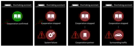 In order to reduce the visual stimulus and information affecting the driver when adding abort conditions to the HMI, all abort reasons or indications were displayed exclusively in the step–progress bar (see Figure 2). Symbols that were already used in other driver assistance systems were used so that the driver could quickly comprehend the new situation [28]. In addition, the symbols were chosen unambiguously so that the driver was aware of the system’s performance [19]. An icon in the form of two trucks on a red background for “cooperation aborted” (Figure 2) was implemented. A recurrent icon is intended to safeguard the driver’s ability to learn [28]. Therefore, a specific icon is always the first indication that the driver receives about the system status when the maneuver is aborted. Initially, it is important to draw the driver’s attention to the cancellation itself and, in a following step, to point out the respective reason [29].