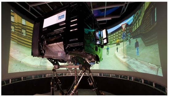 The study was carried out using a dynamic truck driving simulator (see Figure 3). This consisted of an MAN TGS truck cab mounted on a hexa-pod. Due to the 6 degrees of freedom, movements in the driving dynamics could be realized realistically. The simulator had a cylindrical screen that, with the help of 5 projectors, provided the driver with a 210 panoramic view. The rear-view mirrors were represented by 3 LCD monitors. The HMI was shown on a freely programmable display in the position of the original instrument cluster. The driving simulation ran within a computer network with 13 desktop computers. SILAB© 5 of the Würzburg Institute for Traffic Sciences GmbH was used as the driving simulator software.